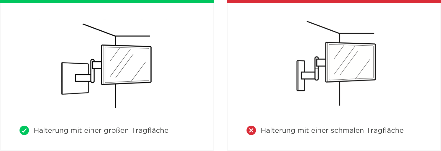 Befestigen Sie die Wandhalterung an der Oberseite mit zwei Alligator-Dübeln. Wiederholen Sie das Gleiche an der Unterseite der Wandhalterung. So verteilt sich die Zugkraft über diese Dübel. Die Befestigungspunkte an der Unterseite tragen allerdings weniger zur Kräfteverteilung bei und werden daher in unserer Berechnung nicht mit berücksichtigt.